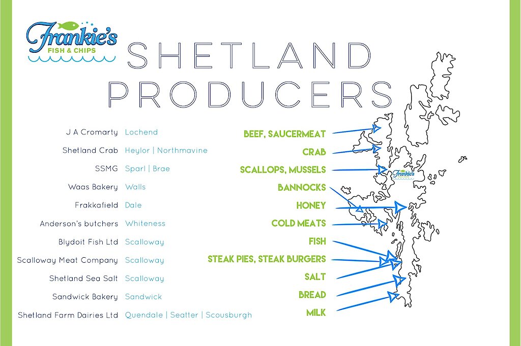 At Frankie’s we pride ourselves on the sustainability of our fish and shellfish which is caught and landed at local markets in Shetland and processed locally. Ninety-eight per cent of these are MSC-certified, and all come from the incredibly rich waters around Shetland, meaning that they are not only sustainably caught or harvested, but that they are very low in food miles. We use as much of Shetland’s fantastic local produce as possible including meat, bread, milk, fudge and salt.